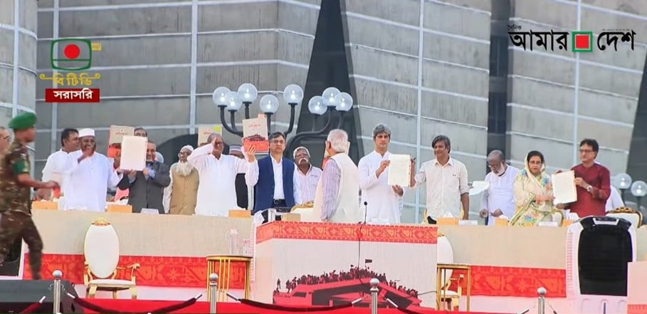এর আগে বৃষ্টি উপেক্ষা করে অনুষ্ঠানস্থলে উপস্থিত হতে শুরু করেন রাজনীতিবিদ, কূটনীতিক ও জুলাই গণঅভ্যুত্থানের সমন্বয়কারীরা।