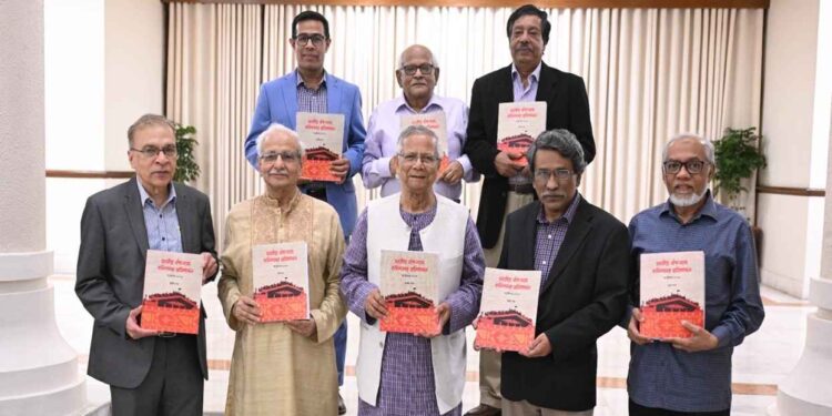 প্রতিবেদন হস্তান্তরকালে উপস্থিত ছিলেন কমিশনের সহসভাপতি অধ্যাপক আলী রীয়াজ, সদস্যরা—বিচারপতি মো. এমদাদুল হক, ড. ইফতেখারুজ্জামান, ড. বদিউল আলম মজুমদার, ড. মো. আইয়ুব মিয়া—এবং প্রধান উপদেষ্টার বিশেষ সহকারী মনির হায়দার।