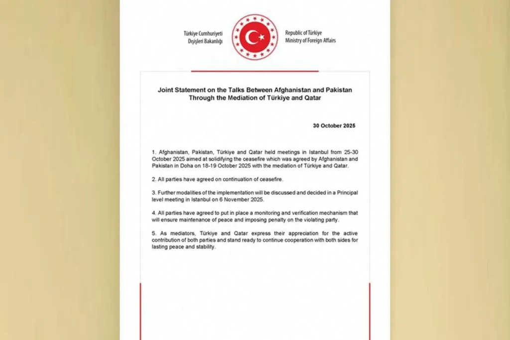 বিবৃতিতে জানানো হয়েছে, দুই দেশের প্রতিনিধিরা যুদ্ধবিরতির ধারাবাহিকতা বজায় রাখতে একমত হয়েছেন। যুদ্ধবিরতির শর্তাবলি ও ভবিষ্যৎ ব্যবস্থা নিয়ে আলোচনার জন্য আগামী ৬ নভেম্বর ইস্তাম্বুলে আবার বৈঠক হবে। সেই সময় পর্যন্ত যেন কোনো সংঘাত না ঘটে— সে বিষয়ে দুই দেশ সতর্ক অবস্থানে থাকবে বলে সিদ্ধান্ত নেওয়া হয়েছে।