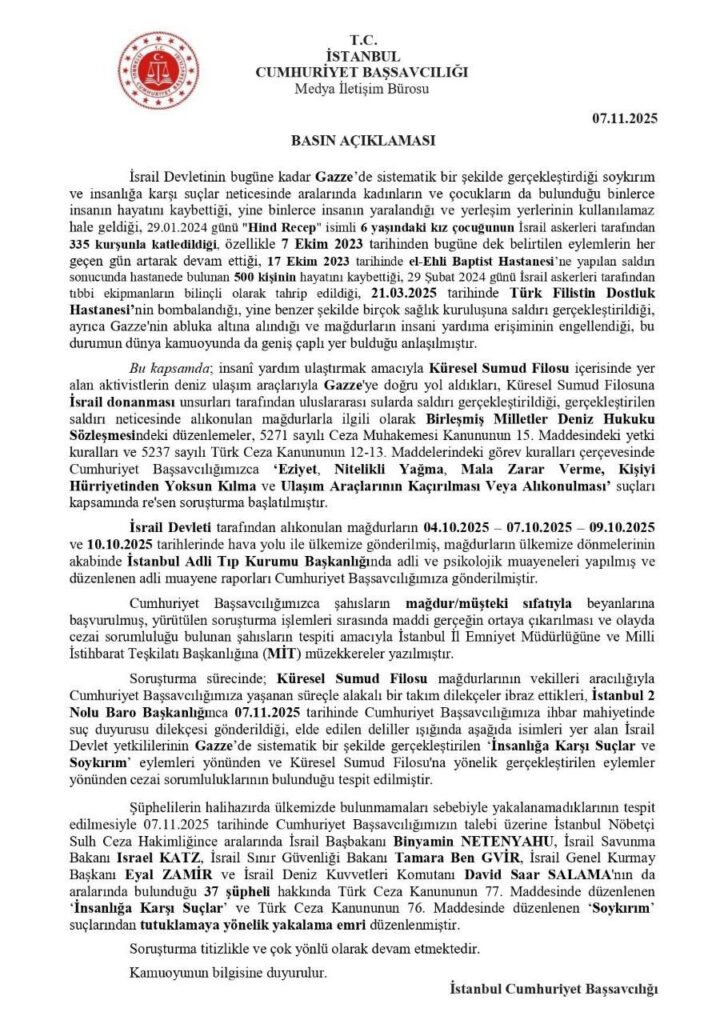 তুরস্কের ইস্তাম্বুলের প্রধান পাবলিক প্রসিকিউটরের কার্যালয় গাজায় গণহত্যা ও হিন্দ রাজাব হত্যাকাণ্ডের অভিযোগে ইসরায়েলের প্রধানমন্ত্রী বেনিয়ামিন নেতানিয়াহু, পররাষ্ট্রমন্ত্রী ইসরায়েল কাট্জ, জাতীয় নিরাপত্তামন্ত্রী ইতামার বেন-গভিরসহ মোট ৩৬ জন ইসরায়েলি কর্মকর্তার বিরুদ্ধে গ্রেফতারি পরোয়ানা জারি করেছে।