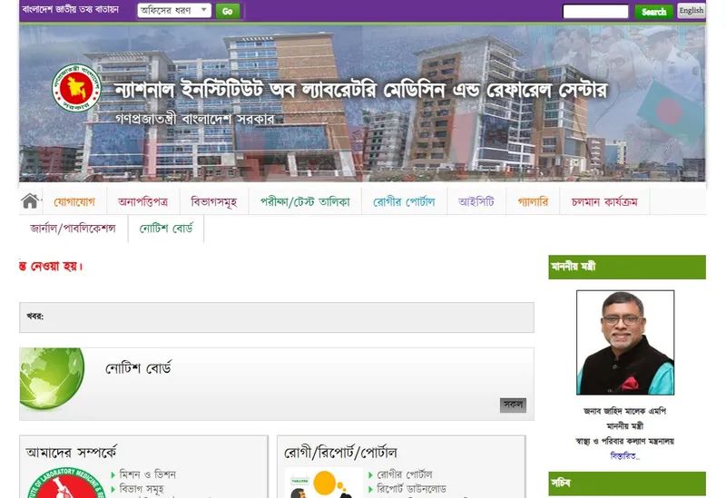 স্বাস্থ্য মন্ত্রণালয়ের অধীন ন্যাশনাল ইনস্টিটিউট অব ল্যাবরেটরি মেডিসিন অ্যান্ড রেফারেল সেন্টারের (NILMRC) ওয়েবসাইটে (https://nilmrc.portal.gov.bd) এখনো স্বাস্থ্য ও পরিবার কল্যাণমন্ত্রী হিসেবে দেখা যাচ্ছে আওয়ামী লীগের সাবেক সংসদ সদস্য জাহিদ মালেকের নাম।