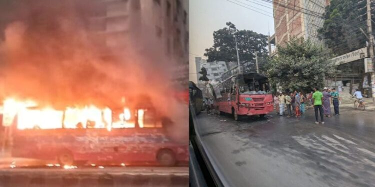 রাজধানীর মেরুল বাড্ডা ও শাহজাদপুর এলাকায় ভিক্টর পরিবহনের দুটি বাসে আগুন দিয়েছে দুর্বৃত্তরা। সোমবার (১০ নভেম্বর) ভোরে এই দুটি স্থানে আগুনের ঘটনা ঘটে।