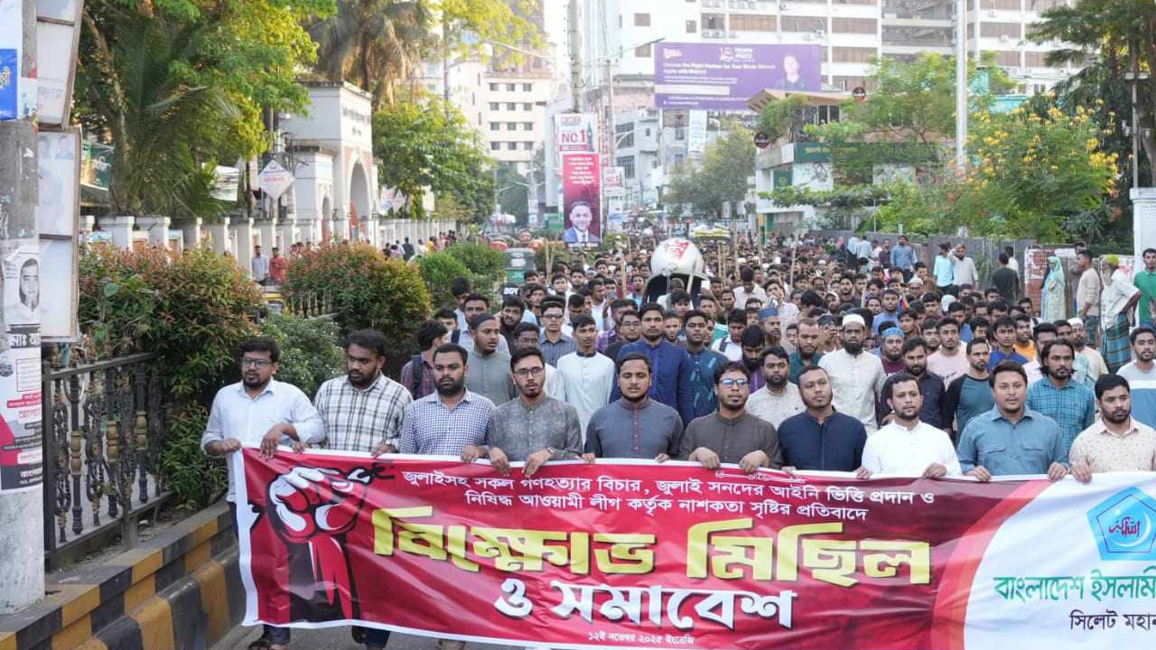জুলাইসহ সকল গণহত্যার বিচার, জুলাই সনদের আইনি ভিত্তি প্রতিষ্ঠা এবং নিষিদ্ধ আওয়ামী লীগের নাশকতা ও অপতৎপরতার প্রতিবাদে বাংলাদেশ ইসলামী ছাত্রশিবির সিলেট মহানগরের উদ্যোগে বিক্ষোভ মিছিল ও সমাবেশ অনুষ্ঠিত হয়েছে।