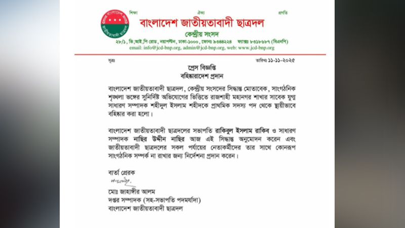 বিজ্ঞপ্তিতে বলা হয়, সাংগঠনিক শৃঙ্খলাভঙ্গের সুনির্দিষ্ট অভিযোগের ভিত্তিতে ছাত্রদলের কেন্দ্রীয় সংসদের সিদ্ধান্ত মোতাবেক শহীদুল ইসলাম শহীদকে প্রাথমিক সদস্য পদ থেকে স্থায়ীভাবে বহিষ্কার করা হয়েছে।