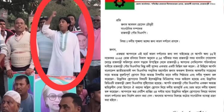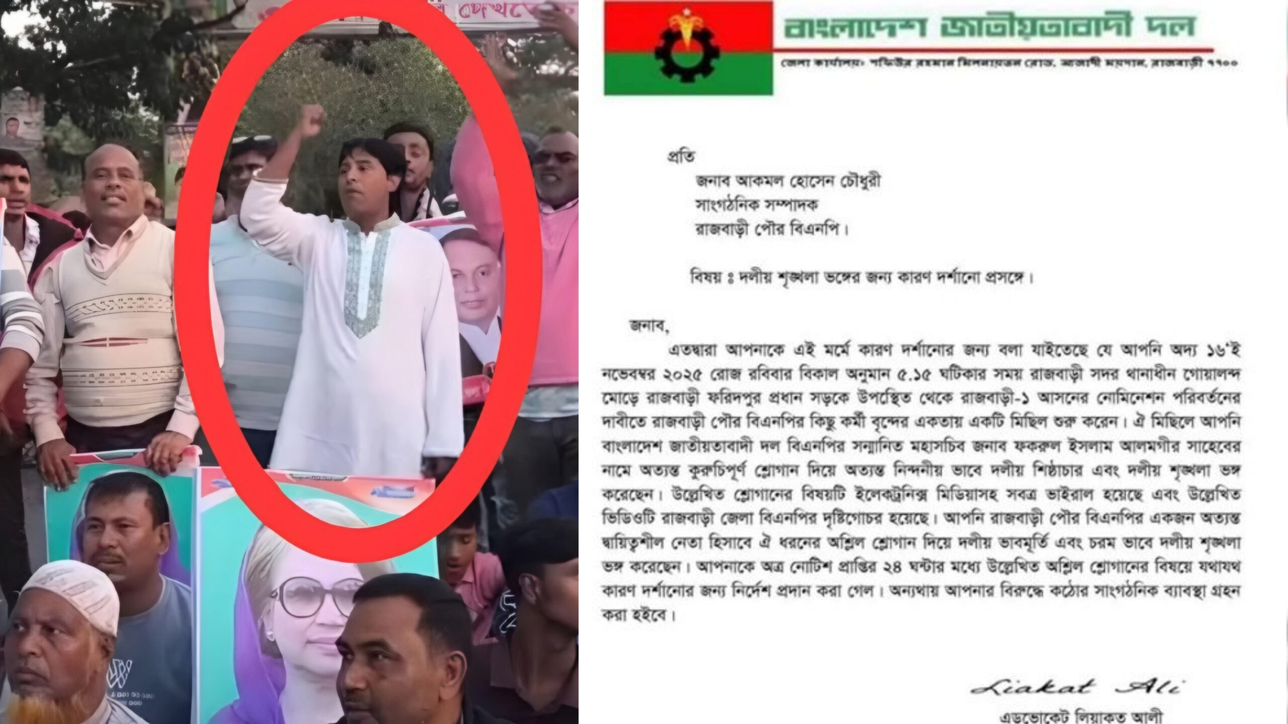 রাজবাড়ী পৌর বিএনপির সাংগঠনিক সম্পাদক আকমল হোসেন চৌধুরীর বিরুদ্ধে কুরুচিপূর্ণ স্লোগান দেওয়ার অভিযোগে কারণ দর্শানোর নোটিশ দিয়েছে জেলা বিএনপি। রবিবার দিবাগত রাতে জেলা বিএনপির আহ্বায়ক অ্যাডভোকেট লিয়াকত আলী বাবু স্বাক্ষরিত দলীয় প্যাডে এ নোটিশ জারি করা হয়। এতে তাকে ২৪ ঘণ্টার মধ্যে ওই স্লোগানের বিষয়ে ব্যাখ্যা দিতে নির্দেশ দেওয়া হয়েছে। নির্দেশনা অমান্য করলে কঠোর সাংগঠনিক ব্যবস্থা নেওয়ার কথা উল্লেখ করা হয়েছে।
