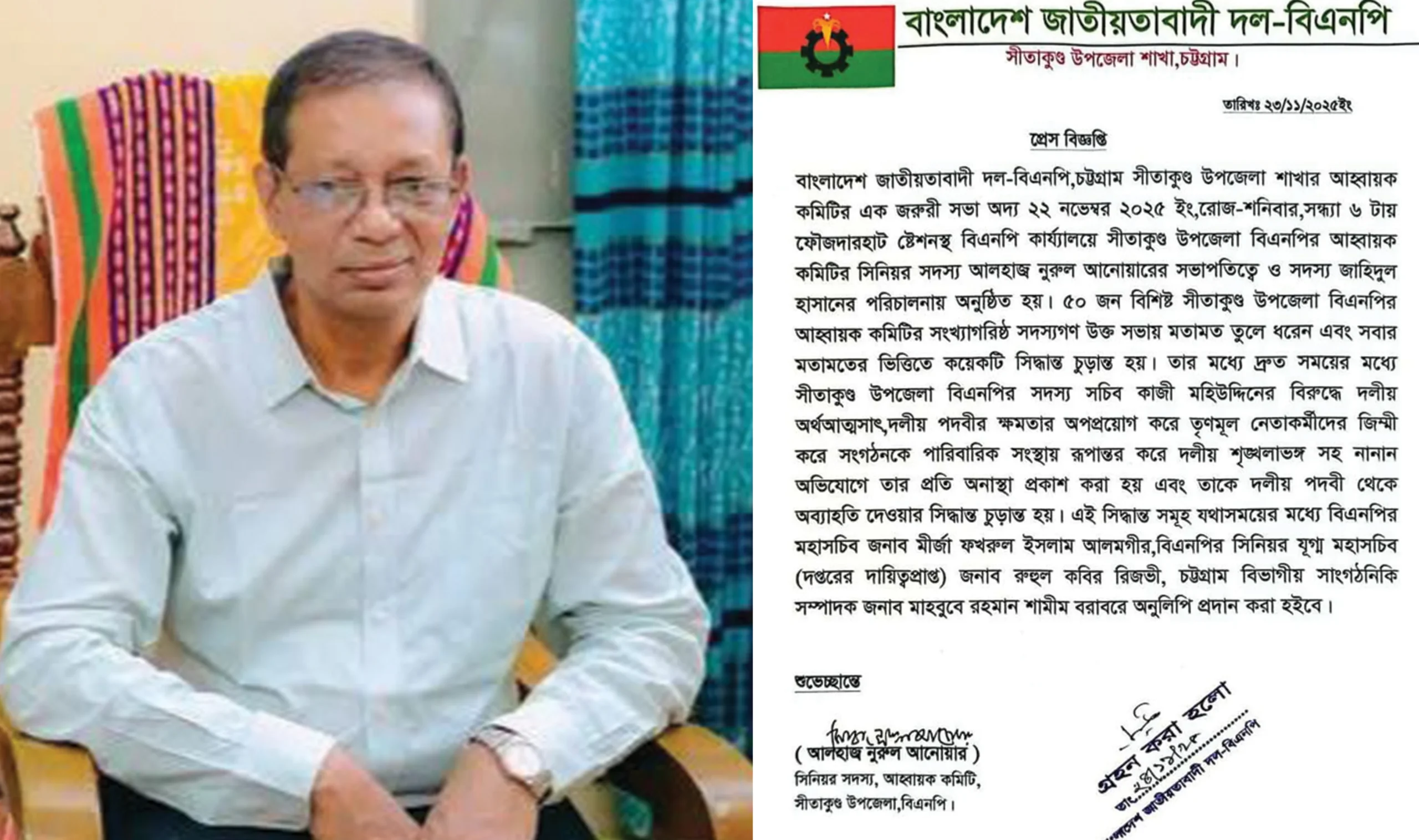 সীতাকুণ্ড উপজেলা বিএনপির সাবেক যুগ্ম আহ্বায়ক জহুরুল আলম জহুর জানান, সংগঠনের অধিকাংশ প্রভাবশালী নেতা ক্ষমতার অপব্যবহার ও আর্থিক অনিয়মের কারণে তাকে প্রাথমিক সদস্যপদসহ সব দায়িত্ব থেকে অব্যাহতি দিয়েছেন। এ সংক্রান্ত নথি মহাসচিব মির্জা ফখরুল ইসলাম আলমগীরসহ কেন্দ্রীয় নেতাদের দপ্তরে পাঠানো হয়েছে।