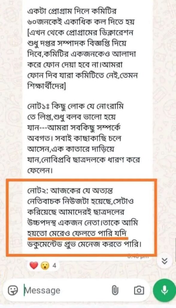 ভাইরাল হওয়া স্ক্রিনশটে দেখা যায়, জাহিদ হাসান লিখেছেন— “আজকের যে অত্যন্ত নেতিবাচক নিউজটা হয়েছে, সেটাও করিয়েছে আমাদের ছাত্রদলের উচ্চপদস্থ একজন নেতা। তাকে আমি হয়তো মেরেও ফেলতে পারি যদি ডকুমেন্টড প্রুভ ম্যানেজ করতে পারি।”
