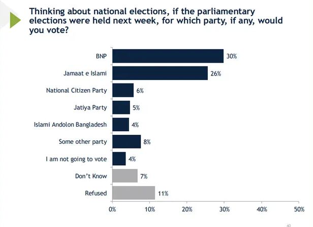 জরিপ অনুযায়ী, আগামী সপ্তাহে নির্বাচন হলে জাতীয় নাগরিক পার্টি (এনসিপি) পাবে ৬ শতাংশ ভোট, জাতীয় পার্টি ৫ শতাংশ, ইসলামী আন্দোলন বাংলাদেশ ৪ শতাংশ এবং অন্যান্য দল মিলিয়ে ৮ শতাংশ ভোট।