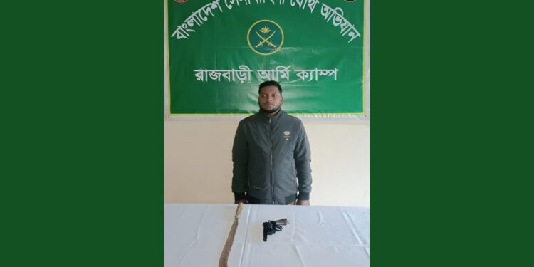 গ্রেপ্তার আলাউদ্দিন পাটোয়ারী ওই গ্রামের শুকুর পাটোয়ারীর ছেলে। অভিযানের সময় তার বাড়িতে তল্লাশি চালিয়ে ‘মেড ইন জার্মানি’ লেখা ছয়–শর্টের একটি বিদেশি রিভলভার এবং একটি রামদা উদ্ধার করা হয়েছে বলে জানিয়েছে সেনাবাহিনীর একটি দায়িত্বশীল সূত্র।