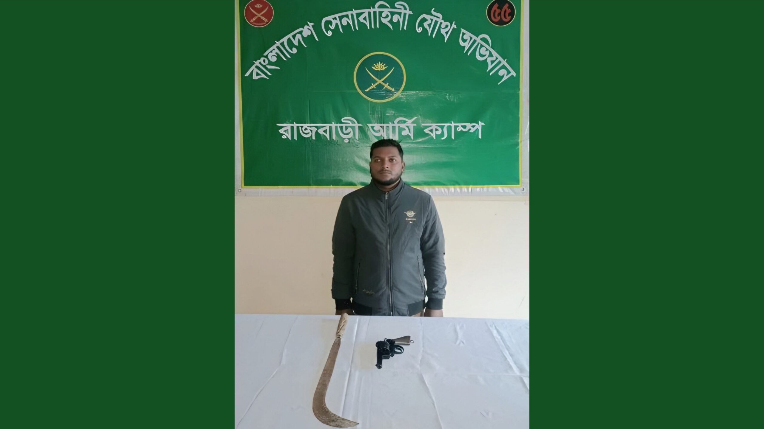 গ্রেপ্তার আলাউদ্দিন পাটোয়ারী ওই গ্রামের শুকুর পাটোয়ারীর ছেলে। অভিযানের সময় তার বাড়িতে তল্লাশি চালিয়ে ‘মেড ইন জার্মানি’ লেখা ছয়–শর্টের একটি বিদেশি রিভলভার এবং একটি রামদা উদ্ধার করা হয়েছে বলে জানিয়েছে সেনাবাহিনীর একটি দায়িত্বশীল সূত্র।