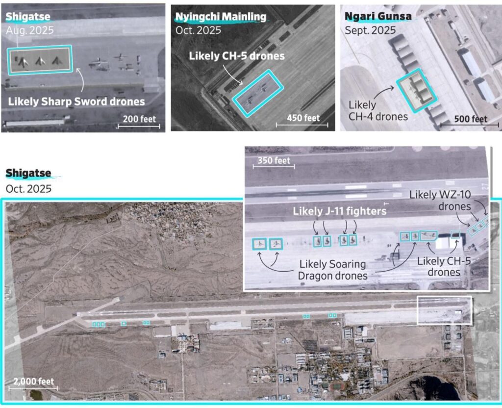নতুন ঘাঁটিগুলোতে ফাইটার জেট, ভারী পরিবহন বিমান এবং একাধিক ধরনের ড্রোন মোতায়েনের সক্ষমতা লক্ষ্য করা গেছে। এর মধ্যে রয়েছে Sharp Sword, Soaring Dragon, CH-4 এবং CH-5 ড্রোন, যেগুলো সীমান্তজুড়ে নজরদারি বৃদ্ধি করতে পারে এবং ভারতীয় সামরিক স্থাপনাগুলোর ওপর স্থায়ী গোয়েন্দা নজরদারি বজায় রাখতে সক্ষম।