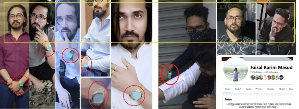 সূত্রগুলো জানায়, ওই ব্যক্তির সঙ্গে সম্পর্কিত একাধিক ছবি সংগ্রহ করা হয়েছে, যা সামাজিক যোগাযোগমাধ্যমে ছড়িয়ে পড়া ছবির সঙ্গে মিল রয়েছে। দাবি করা হচ্ছে, হাদীর পাশে বসে থাকা ব্যক্তির ঘড়ির সঙ্গে ফয়সালের পূর্বে প্রকাশিত ছবির ঘড়ির মিল পাওয়া গেছে। এছাড়া কিছু পর্যবেক্ষক জানান, সাম্প্রতিক সময়ে আওয়ামী লীগের ঝটিকা মিছিলে ওই ব্যক্তিকে দেখা গেছে।