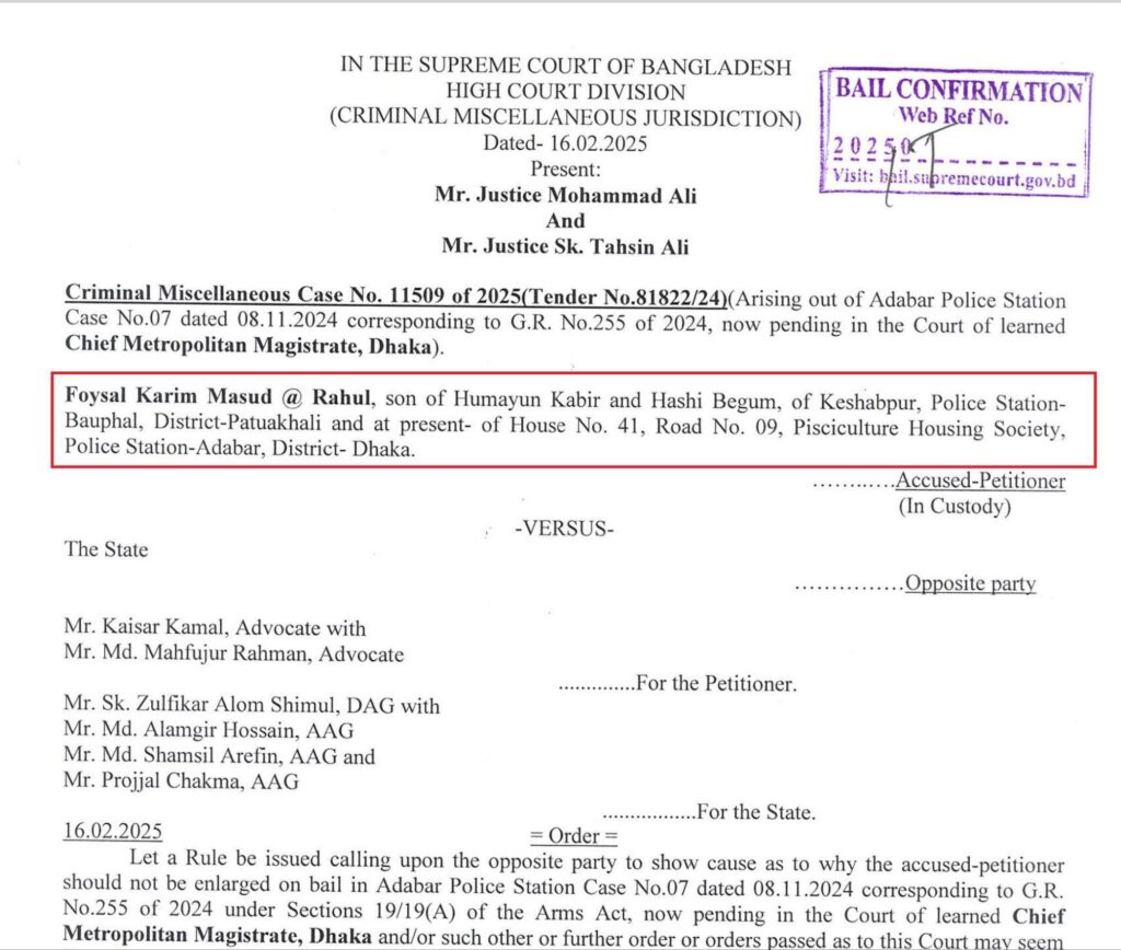 হাদিকে গুলিবর্ষণকারী ফয়সালের অস্ত্র মামলায় আইনজীবী ছিলেন বিএনপির এমপি প্রার্থী