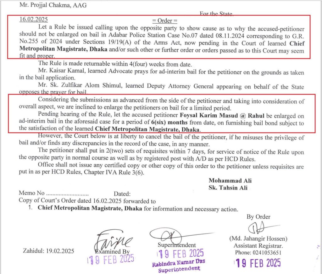 ওসমান হাদির ওপর গুলিবর্ষণের ঘটনায় আলোচিত সাবেক ছাত্রলীগ নেতা ফয়সাল করিম মাসুদের একটি পুরোনো মামলার আইনগত প্রক্রিয়া নতুন করে আলোচনায় এসেছে। আদালতের নথি অনুযায়ী, ২০২৪ সালের ৮ নভেম্বর একটি ডাকাতির ঘটনায় অস্ত্রসহ গ্রেপ্তার হন ফয়সাল করিম মাসুদ। এ ঘটনায় তার বিরুদ্ধে অস্ত্র আইনে মামলা দায়ের করা হয়।