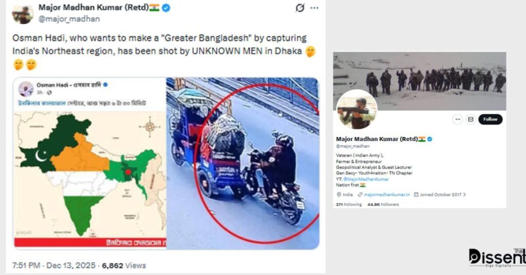 অনুসন্ধানে আরও দেখা যায়, ওসমান হাদীর একটি ফেসবুক পোস্টের বিকৃত ব্যাখ্যা দিয়ে তাকে ভারতের উত্তর-পূর্ব অঞ্চল দখল করে ‘গ্রেটার বাংলাদেশ’ গড়ার পরিকল্পনার সঙ্গে যুক্ত করার চেষ্টা করা হয়েছে। অথচ আলোচিত ছবিতে ভারত ও বাংলাদেশের মানচিত্র আলাদা রঙে দেখানো ছিল এবং স্বাধীন ফ্যাক্টচেকাররা আগেও এ ধরনের দাবিকে অসত্য প্রমাণ করেছে।