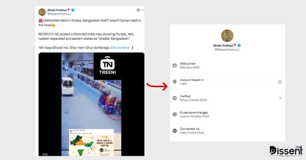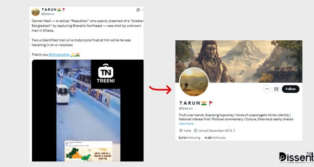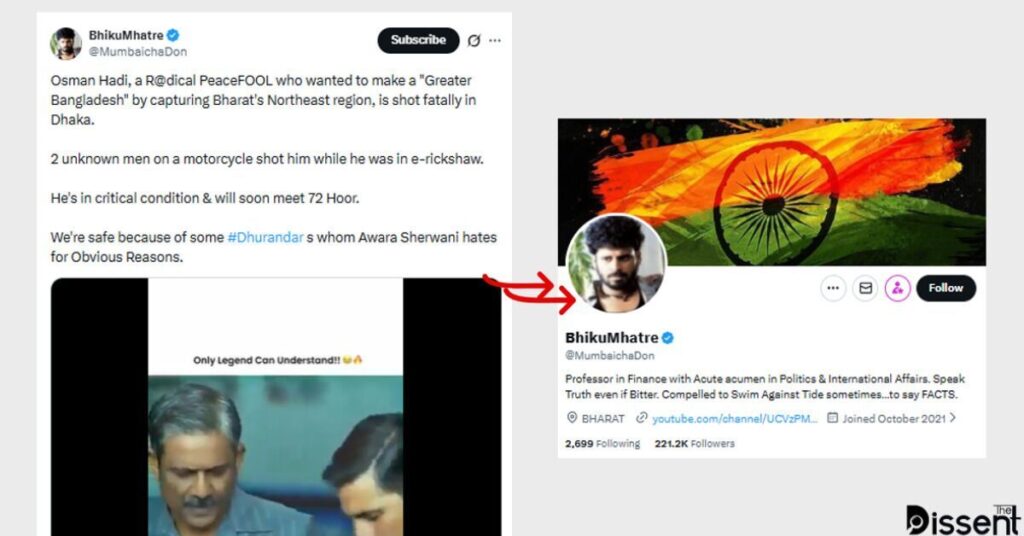 দ্য ডিসেন্টের অনুসন্ধানে দেখা যায়, ভারতের কিছু হিন্দুত্ববাদী অ্যাকটিভিস্ট ও সাবেক সেনা কর্মকর্তা একাধিক পোস্টে ওসমান হাদীকে ‘ভারতবিরোধী’ দাবি করে তার ওপর হামলাকে সমর্থন জানিয়েছেন। এসব পোস্টে #Dhurandhar হ্যাশট্যাগ ব্যবহার করে হামলাকারীদের ধন্যবাদ জানানো হয় এবং ভবিষ্যতেও ভারতবিরোধীদের একই পরিণতির হুমকি দেওয়া হয়।