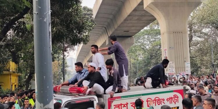 তিনি জানান, উপস্থিতরা জনতাকে শান্ত ও নিবৃত্ত করার সর্বোচ্চ চেষ্টা করেছেন, কিন্তু তা সম্ভব হয়নি। কারণ অ্যাম্বুলেন্সের ভেতরে যে মানুষটি শুয়ে ছিলেন, তিনি ছিলেন বাংলাদেশের মানুষের হৃদয়ের প্রতীক। লাশ স্পর্শ করতে না পারলেও অন্তত লাশবাহী গাড়িটা একবার ছুঁয়ে দেখার আকাঙ্ক্ষা ছিল মানুষের মধ্যে।
