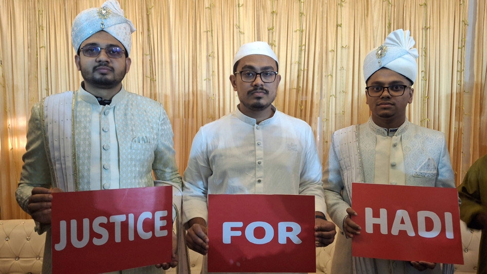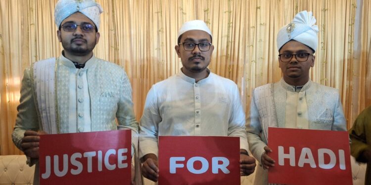 বিয়ের অনুষ্ঠানে ব্যতিক্রমীভাবে ইনকিলাব মঞ্চের মুখপাত্র শহীদ শরীফ ওসমান হাদির হত্যার বিচারের দাবিও জানান নবদম্পতিরা। ডাকসু নেতা এবি জুবায়ের সামাজিক যোগাযোগমাধ্যমে প্রকাশিত একাধিক ছবিতে দেখা যায়, বরের সাজে এসএম ফরহাদ ও মহিউদ্দীন খান ‘জাস্টিস ফর হাদি’ লেখা প্ল্যাকার্ড হাতে দাঁড়িয়ে আছেন। ছবিগুলো শেয়ার করে এবি জুবায়ের লেখেন, বিয়ের অনুষ্ঠানেও সহযোদ্ধাকে ভুলে না যাওয়ার জন্য এসএম ফরহাদ ও মহিউদ্দীন খানকে ধন্যবাদ জানিয়ে তিনি বলেন, “আমরা সবাই হাদি হব— যুগে যুগে লড়ে যাব।”