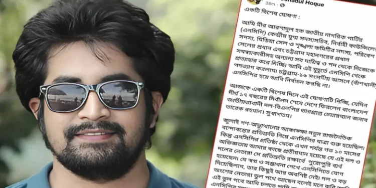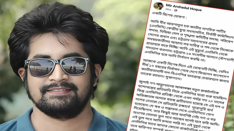 বিএনপির ভারপ্রাপ্ত চেয়ারম্যান তারেক রহমানের স্বদেশ প্রত্যাবর্তন দিবসে তাকে স্বাগত জানিয়ে জাতীয় নাগরিক পার্টি (এনসিপি) থেকে পদত্যাগের ঘোষণা দিয়েছেন দলটির কেন্দ্রীয় যুগ্ম সদস্যসচিব ও চট্টগ্রাম-১৬ আসনের মনোনীত সংসদ সদস্য প্রার্থী মীর আরশাদুল হক।