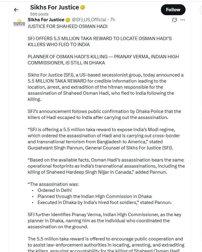 এসএফজের জেনারেল কাউন্সেল গুরপতবন্ত সিং পান্নুন এক বিবৃতিতে বলেন, শহীদ ওসমান হাদির হত্যাকাণ্ডে ভারতের মোদি সরকারের সম্পৃক্ততা রয়েছে। তার ভাষায়, বাংলাদেশ থেকে শুরু করে যুক্তরাষ্ট্র পর্যন্ত সীমান্ত পেরিয়ে পরিচালিত আন্তঃরাষ্ট্রীয় সন্ত্রাসের অংশ হিসেবেই এই হত্যাকাণ্ড সংঘটিত হয়েছে।