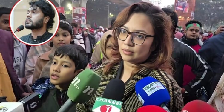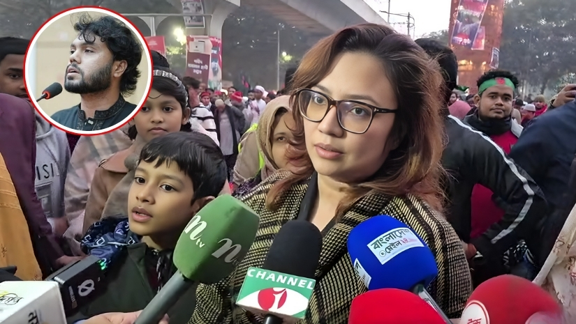 শুক্রবার (২ জানুয়ারি) বিকেলে শাহবাগে ইনকিলাব মঞ্চের কর্মসূচিতে উপস্থিত হয়ে গণমাধ্যমের সঙ্গে কথা বলেন তিনি। তিনি বলেন, শহীদ ওসমান হাদির হত্যাকাণ্ডের বিচার একমাত্র দাবি। এই দাবিতে আরও বেশি মানুষের রাজপথে নামা প্রয়োজন। শুধুমাত্র নির্দিষ্ট কিছু মানুষ নয়, বিভিন্ন বয়স ও শ্রেণি-পেশার মানুষের অংশগ্রহণ জরুরি বলে তিনি মন্তব্য করেন।