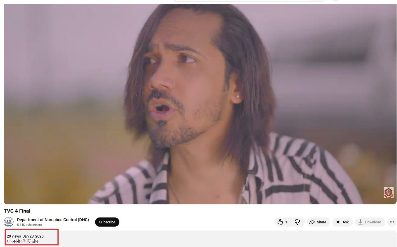 আজ শনিবার (৩ জানুয়ারি, ২০২৬) সকালে ডিএনসির অফিশিয়াল ইউটিউব চ্যানেলে ‘TVC 4 Final’ শিরোনামের ওই বিজ্ঞাপনটি প্রকাশিত অবস্থায় দেখা যায়। তবে সকাল ১১টার দিকে কোনো পূর্বঘোষণা ছাড়াই বিজ্ঞাপনটি হঠাৎ করে ইউটিউব চ্যানেল থেকে সরিয়ে ফেলা হয়।