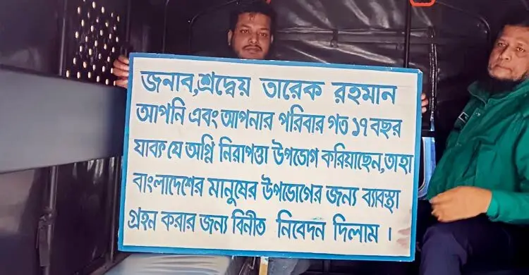 প্রত্যক্ষদর্শী ও সংশ্লিষ্ট সূত্র জানায়, বিএনপি চেয়ারপারসনের কার্যালয়ের সামনে দাঁড়িয়ে মোদাচ্ছের রহমান একটি প্ল্যাকার্ড প্রদর্শন করছিলেন। প্ল্যাকার্ডে লেখা ছিল- ‘জনাব, শ্রদ্ধেয় তারেক রহমান আপনি এবং আপনার পরিবার গত ১৭ বছর যাবৎ যে অগ্নি নিরাপত্তা উপভোগ করিয়াছেন, তাহা বাংলাদেশের মানুষের উপভোগের জন্য ব্যবস্থা গ্রহণ করার জন্য বিনীত নিবেদন দিলাম।’