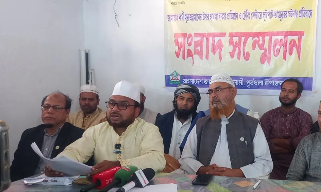 নেত্রকোণার পূর্বধলায় গভীর রাতে বাংলাদেশ জামায়াতে ইসলামীর এক কর্মীর ব্যবসা প্রতিষ্ঠানে হামলা, ভাঙচুর ও লুটপাটের অভিযোগ উঠেছে। এ ঘটনার প্রতিবাদ জানিয়ে এবং দোষীদের দ্রুত গ্রেপ্তারের দাবিতে সংবাদ সম্মেলন করেছে উপজেলা জামায়াতে ইসলামী।