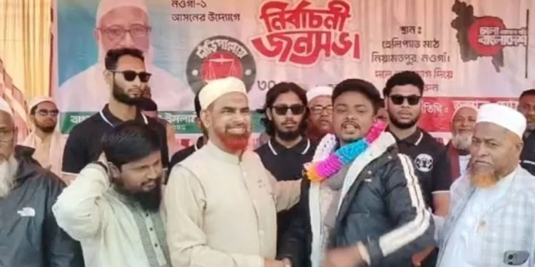 দল ত্যাগের পর বিদ্যুৎ চন্দ্র মাহাতোকে গলায় মালা পরিয়ে স্বাগত জানান নওগাঁ-১ (সাপাহার, পোরশা ও নিয়ামতপুর) আসনে জামায়াত মনোনীত প্রার্থী অধ্যক্ষ মাহবুবুল আলম।