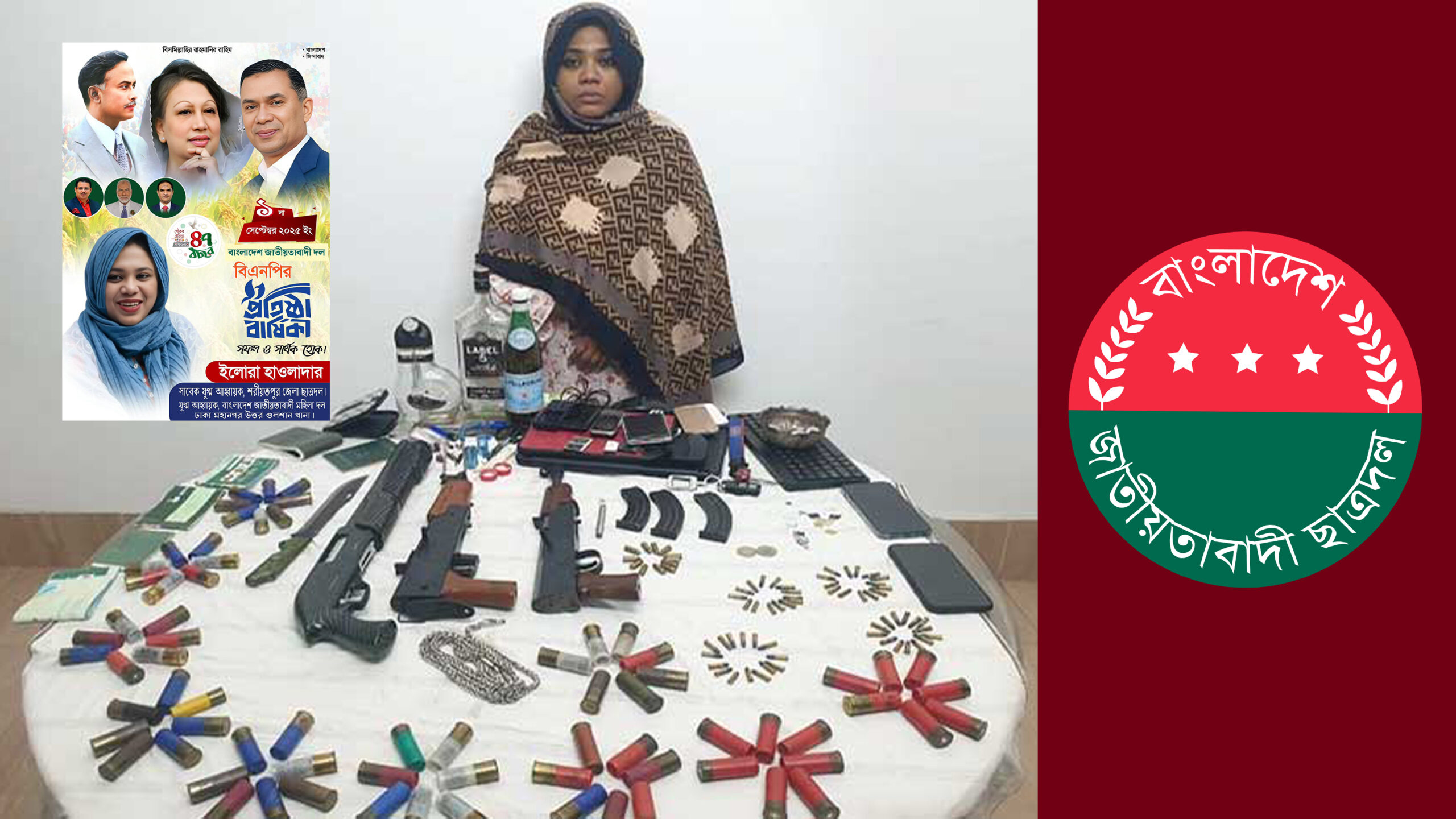 গ্রেপ্তারকৃত ইলোরা হাওলাদার শরীয়তপুর জেলা ছাত্রদলের সাবেক যুগ্ম আহ্বায়ক এবং বর্তমানে জাতীয়তাবাদী মহিলা দলের রাজনীতির সঙ্গে সক্রিয়ভাবে জড়িত। তল্লাশিকালে তার বাসা থেকে একটি শটগান ও ৭১ রাউন্ড কার্তুজ, দুটি একে-২২ বোর রাইফেল ও ৫৭ রাউন্ড গুলি এবং তিনটি ম্যাগাজিন উদ্ধার করা হয়। এ ছাড়াও ৯ এমএম পিস্তলের ১২ রাউন্ড গুলি, একটি অত্যাধুনিক ডেগার এবং বিদেশি মদের বোতল জব্দ করা হয়েছে। নাশকতার কাজে ব্যবহারের সন্দেহে একটি মোটরসাইকেলসহ বিপুল পরিমাণ অবৈধ সরঞ্জামও উদ্ধার করে সেনাবাহিনী।
