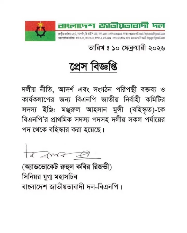 বিজ্ঞপ্তিতে উল্লেখ করা হয়েছে, দলীয় নীতি, আদর্শ এবং সংগঠন পরিপন্থী কার্যকলাপের অভিযোগে তার প্রাথমিক সদস্য পদসহ সব পর্যায়ের পদ বাতিল করা হয়েছে। এর ফলে দীর্ঘদিনের এই বিএনপি নেতা এখন দলীয় পরিচয় হারালেন।