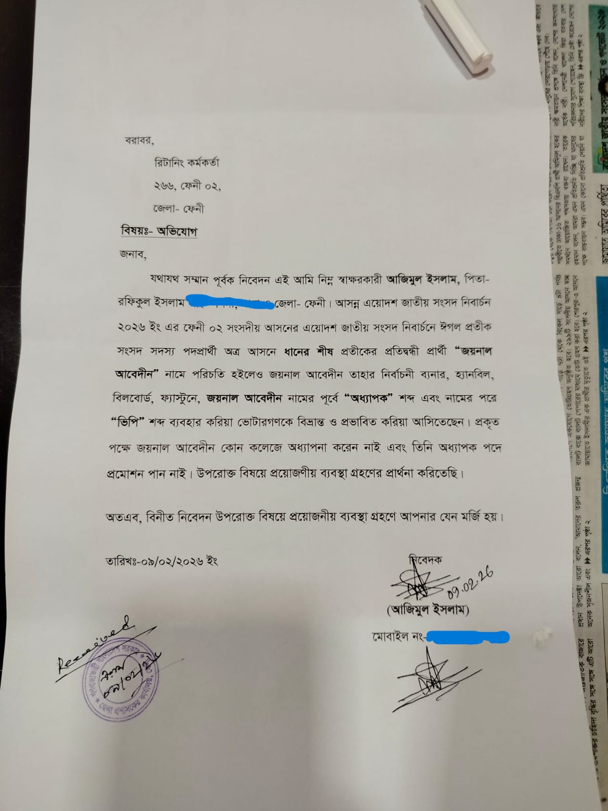 ফেনী-২ আসনের বিএনপির সংসদ সদস্য প্রার্থী জয়নাল আবেদীনের বিরুদ্ধে নির্বাচনী প্রচারপত্রে নামের আগে ‘অধ্যাপক’ ও শেষে ‘ভিপি’ পদবি ব্যবহার করে ভোটারদের বিভ্রান্ত করার অভিযোগ উঠেছে। সোমবার (১০ ফেব্রুয়ারি) এই বিষয়ে জেলা প্রশাসক ও রিটার্নিং কর্মকর্তা মনিরা হকের কাছে লিখিত অভিযোগ দিয়েছেন আজিমুল ইসলাম নামের এক ভোটার।