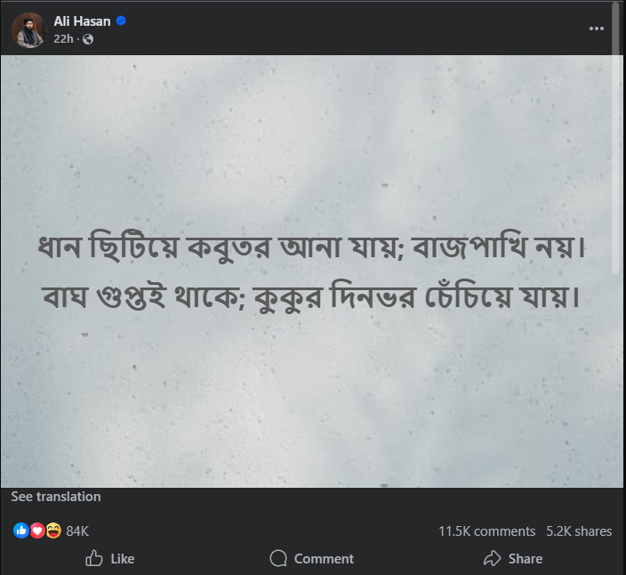 দেশের আলোচিত ইসলামিক স্কলার মুফতি আলী হাসান উসামার একটি ফেসবুক স্ট্যাটাসকে কেন্দ্র করে সামাজিক যোগাযোগমাধ্যমে ব্যাপক তোলপাড় শুরু হয়েছে। মঙ্গলবার (১০ ফেব্রুয়ারি) তার অফিশিয়াল পেজে দেওয়া এক রূপকধর্মী পোস্টে তিনি লেখেন, ‘ধান ছিটিয়ে কবুতর আনা যায়; বাজপাখি নয়। বাঘ গুপ্তই থাকে; কুকুর দিনভর চেঁচিয়ে যায়।’