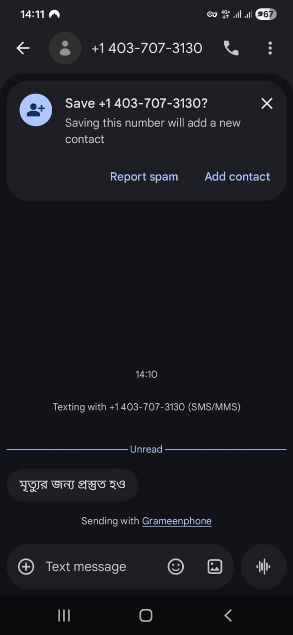 বিভিন্ন নাম্বার থেকে তাকে কল দেয়া হচ্ছে এবং মোবাইলে মেসেজ দেয়া হচ্ছে। একটি নাম্বার থেকে টেক্সট মেসেজ সেন্ড করা হয়। তাতে লিখা হয়, মৃত্যর জন্যে প্রস্তুত হও।