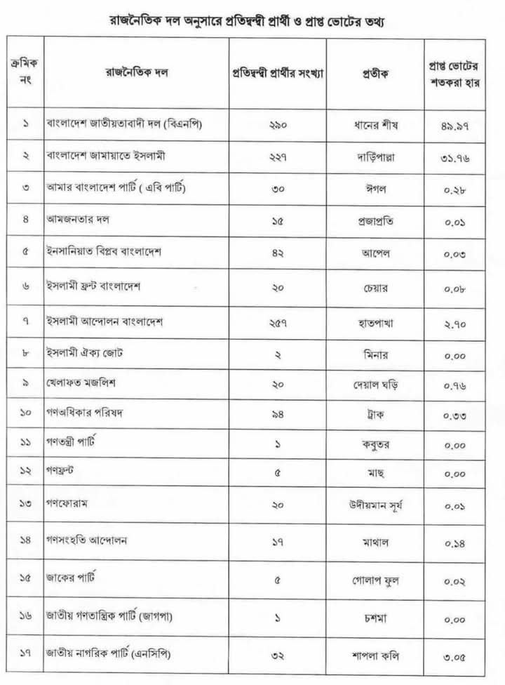 ত্রয়োদশ জাতীয় সংসদ নির্বাচনের আনুষ্ঠানিক ফলাফল ও প্রাপ্ত ভোটের পরিসংখ্যান প্রকাশ করেছে নির্বাচন কমিশন (ইসি)। রোববার (১৫ ফেব্রুয়ারি) ইসির জনসংযোগ শাখা থেকে জানানো হয়, এবারের নির্বাচনে বিএনপি ৪৯.৯৭ শতাংশ ভোট পেয়ে একক সংখ্যাগরিষ্ঠতা অর্জন করেছে। অন্যদিকে, জামায়াতে ইসলামী পেয়েছে ৩১.৭৬ শতাংশ ভোট।