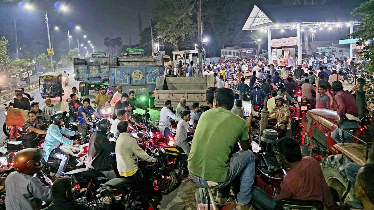 ঠাকুরগাঁও জেলায় গত তিন সপ্তাহ ধরে জ্বালানি তেলের তীব্র সংকট দেখা দিয়েছে। জেলার ফিলিং স্টেশনগুলোতে দীর্ঘ লাইনে দাঁড়িয়েও তেলের দেখা পাচ্ছেন না গ্রাহকরা। অধিকাংশ পাম্পে ‘তেল নেই’ নোটিশ ঝুললেও রহস্যজনকভাবে স্থানীয় হাট-বাজারগুলোতে চড়া দামে প্রকাশ্যে বিক্রি হচ্ছে ডিজেল, পেট্রোল ও অকটেন। এই বৈপরীত্যে চরম ভোগান্তিতে পড়েছেন সাধারণ মানুষ, বিশেষ করে কৃষক ও মোটরসাইকেল চালকরা।