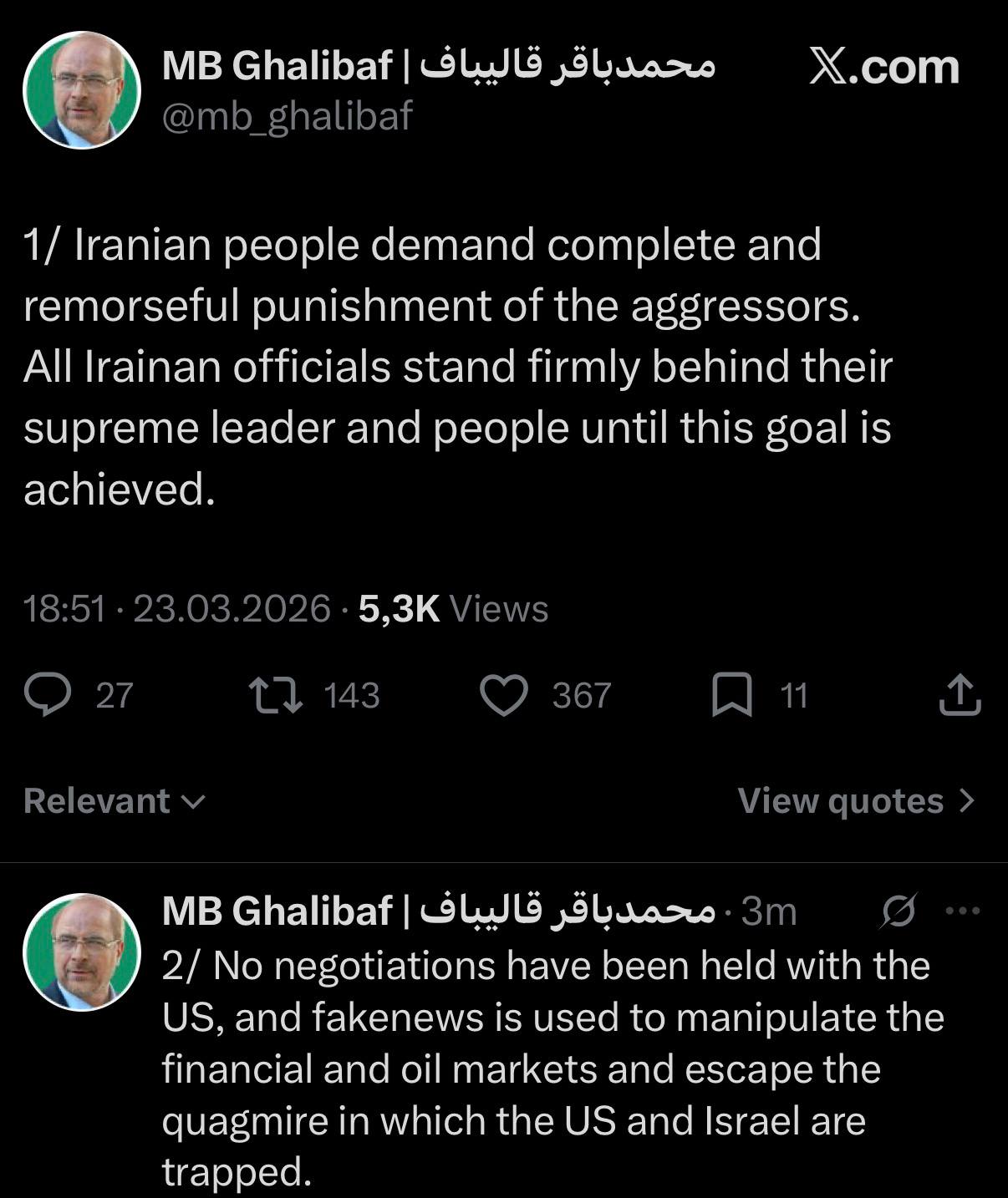এর আগে ট্রাম্প দাবি করেছিলেন যে, ইরানের সাথে তার ‘খুব ভালো ও ফলপ্রসূ’ আলোচনা হয়েছে এবং এর ফলে তিনি ইরানের বিদ্যুৎ কেন্দ্রগুলোতে হামলা চালানোর পরিকল্পনা পাঁচ দিনের জন্য স্থগিত করেছেন। ট্রাম্পের এই দাবিকে গালিবফ কেবল ভুয়া সংবাদই বলেননি, বরং একে যুক্তরাষ্ট্রের একটি রাজনৈতিক চাল হিসেবে অভিহিত করেছেন।