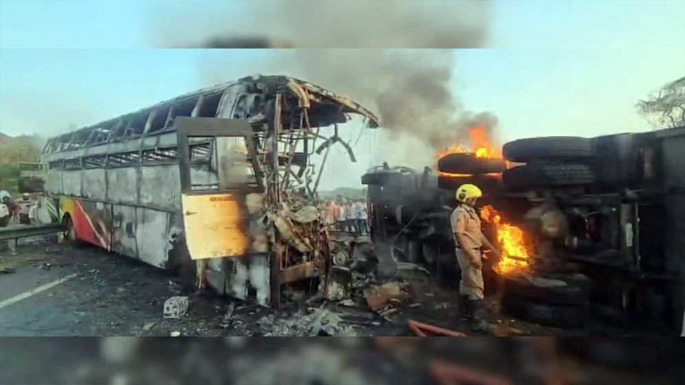 ভারতের অন্ধ্রপ্রদেশের মার্কাপুরম জেলায় যাত্রীবাহী বাসের সঙ্গে একটি লরির ভয়াবহ সংঘর্ষে অন্তত ১৩ জন নিহত হয়েছেন। বৃহস্পতিবার (২৬ মার্চ) ভোরে এই মর্মান্তিক দুর্ঘটনাটি ঘটে বলে নিশ্চিত করেছে স্থানীয় পুলিশ। ‘হরিকৃষ্ণ ট্রাভেলস’-এর একটি বাস তেলেঙ্গানার নির্মল থেকে নেল্লোরের দিকে যাওয়ার পথে একটি টিপার লরির সঙ্গে মুখোমুখি সংঘর্ষ হয় এবং মুহূর্তেই বাসটিতে দাউদাউ করে আগুন ধরে যায়।