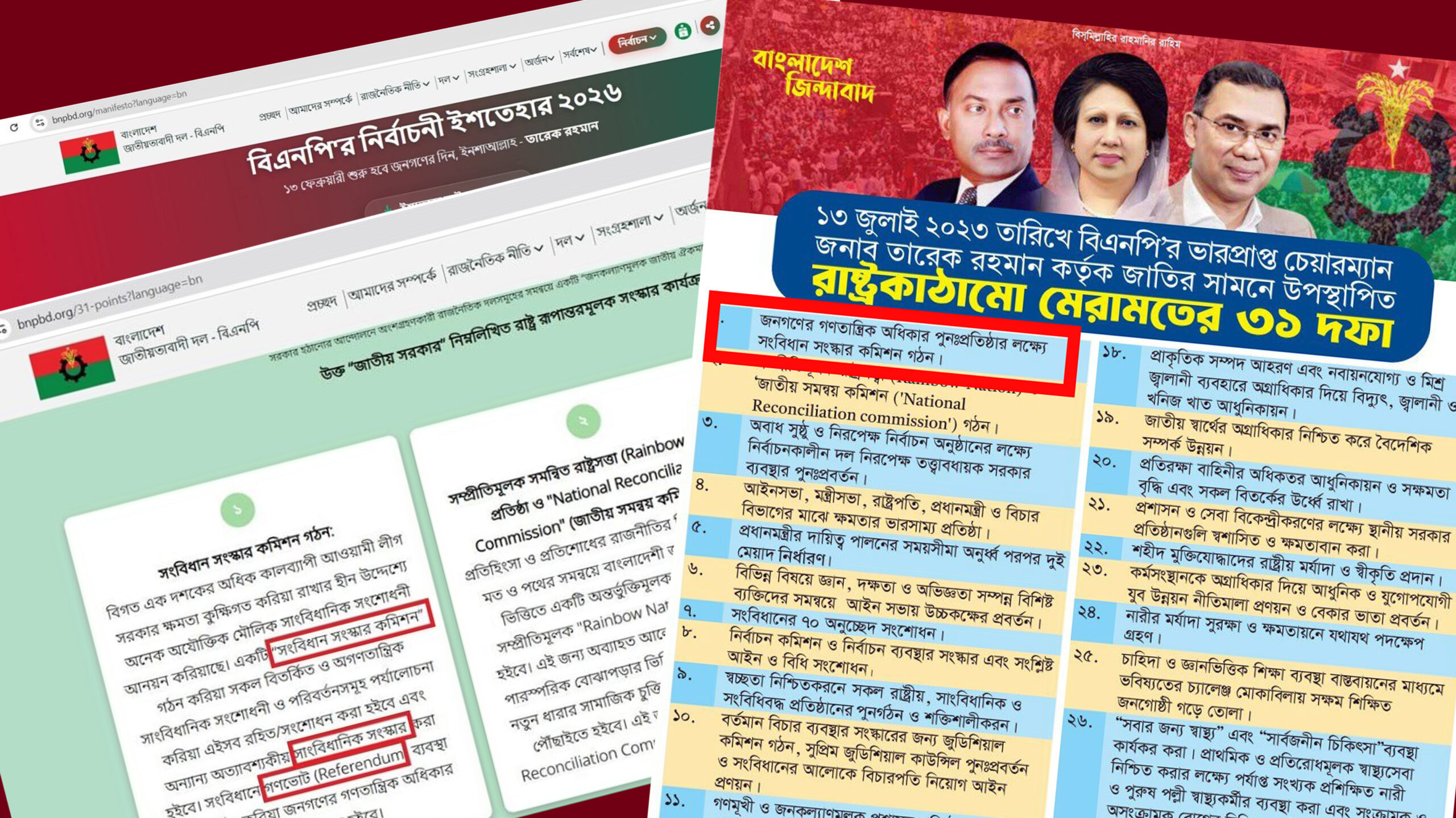 বিএনপি তাদের নির্বাচনী ইশতেহারের প্রথম এবং প্রধান দফাকেই বর্তমানে অস্বীকার করছে বলে রাজনৈতিক মহলে তীব্র সমালোচনা শুরু হয়েছে। ক্ষমতায় আসার আগে দলটি রাষ্ট্রকাঠামো মেরামতের যে ৩১ দফা ঘোষণা করেছিল, এখন তা বাস্তবায়নে টালবাহানা করছে বলে অভিযোগ উঠেছে। বিশেষ করে সংবিধান সংস্কারের বদলে সংশোধনের পথে হাঁটা এবং গণভোট বা রেফারেন্ডাম ব্যবস্থা বাতিলের পরিকল্পনাকে দলটির রাজনৈতিক ‘প্রতারণা’ হিসেবে দেখছেন বিশ্লেষকরা।