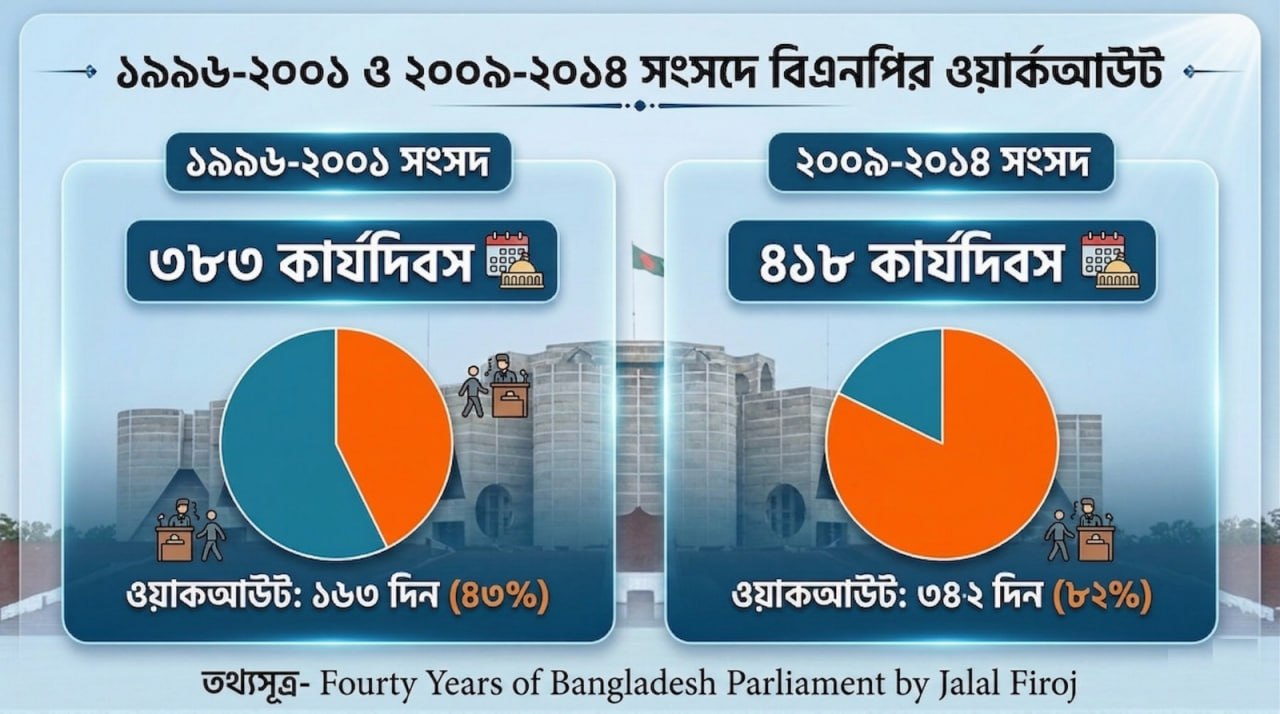 সম্প্রতি জাতীয় নাগরিক পার্টি (এনসিপি) ও জামায়াতে ইসলামীকে নিয়ে বিএনপির নেতা-কর্মীদের ‘ওয়াকআউট পার্টি’ হিসেবে বিদ্রুপ করার প্রেক্ষিতে এই পরিসংখ্যানগুলো সামনে এসেছে। সমালোচকরা বলছেন, যারা সংসদের সিংহভাগ সময় বর্জন করে রেকর্ড গড়েছে, তাদের মুখে অন্য দলকে নিয়ে এমন মন্তব্য মানায় না।