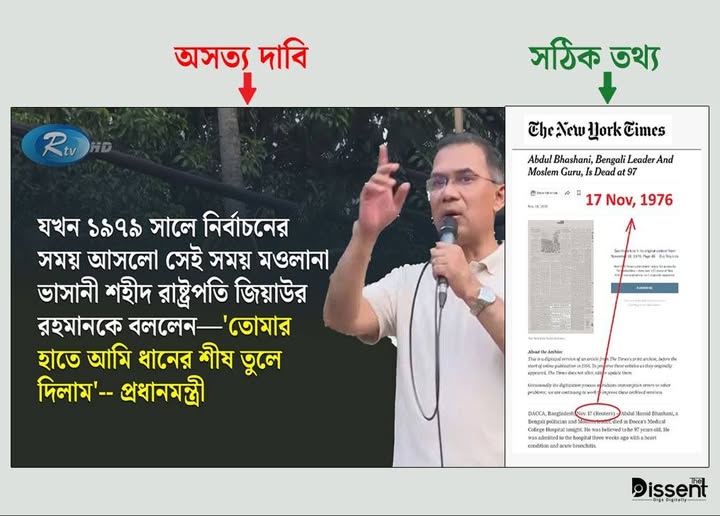তবে প্রধানমন্ত্রীর এই দাবিটি সত্য হওয়ার সুযোগ নেই। কারণ, মওলানা ভাসানী মারা যান ১৯৭৬ সালের ১৭ নভেম্বর। বিশ্বের শীর্ষ সংবাদমাধ্যমগুলোতে ভাসানীর মৃত্যুর সংবাদ প্রকাশিত হয় (দেখুন স্ক্রিনশট)।