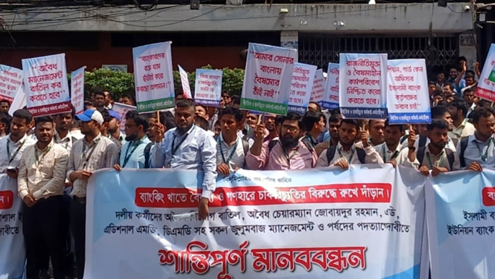 রাজধানীর মতিঝিলে এস আলম গ্রুপের কাছে ইসলামী ব্যাংকসহ পাঁচটি ব্যাংকের নিয়ন্ত্রণ ফিরিয়ে দেওয়া এবং চাকরিচ্যুত কর্মীদের পুনর্বহালের দাবিতে অবস্থান কর্মসূচি পালন করেছেন সাবেক ব্যাংক কর্মকর্তারা। রোববার সকাল থেকে মতিঝিলের দিলকুশা এলাকায় ইসলামী ব্যাংকের প্রধান কার্যালয়ের সামনে এই বিক্ষোভ অনুষ্ঠিত হয়। কর্মসূচিতে ইসলামী ব্যাংক, ফার্স্ট সিকিউরিটি, ইউনিয়ন ব্যাংক, আল-আরাফাহ, গ্লোবাল ইসলামী ও সোশ্যাল ইসলামী ব্যাংকের সাবেক কর্মীরা অংশ নেন।