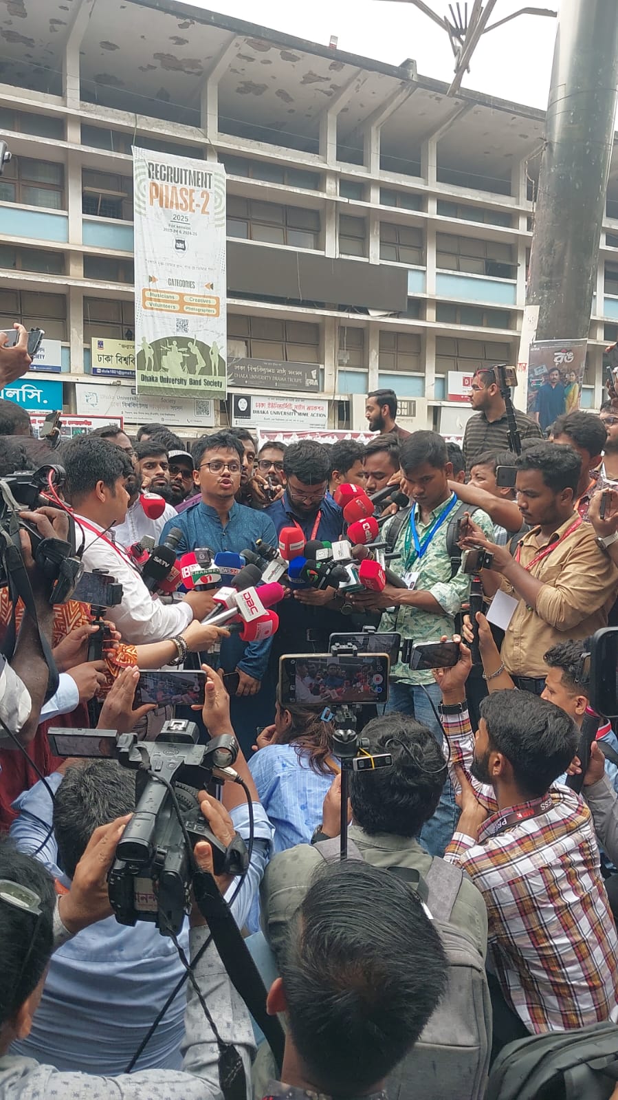 সকাল ৮টা থেকে শিক্ষার্থীরা উদ্দীপনা নিয়ে ভোট দিতে লাইনে দাঁড়ান। তবে শুরুর এই উৎসবমুখর পরিবেশ দ্রুতই বিশৃঙ্খলায় রূপ নেয়। প্রার্থীরা কেন্দ্রের প্রবেশপথে সরাসরি ভোট চান, লিফলেট ও প্রচার সামগ্রী বিতরণ করেন—যা স্পষ্টতই নির্বাচন কমিশনের বিধি লঙ্ঘন।