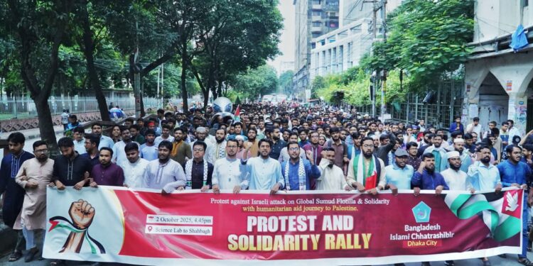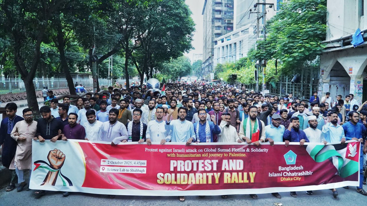 রাজধানীতে ফিলিস্তিনে মানবিক সহায়তা বহনকারী গ্লোবাল সুমুদ ফ্লোটিলায় ইসরায়েলি হামলার প্রতিবাদে বাংলাদেশ ইসলামী ছাত্রশিবিরের উদ্যোগে বিক্ষোভ ও সংহতি সমাবেশ অনুষ্ঠিত হয়েছে।